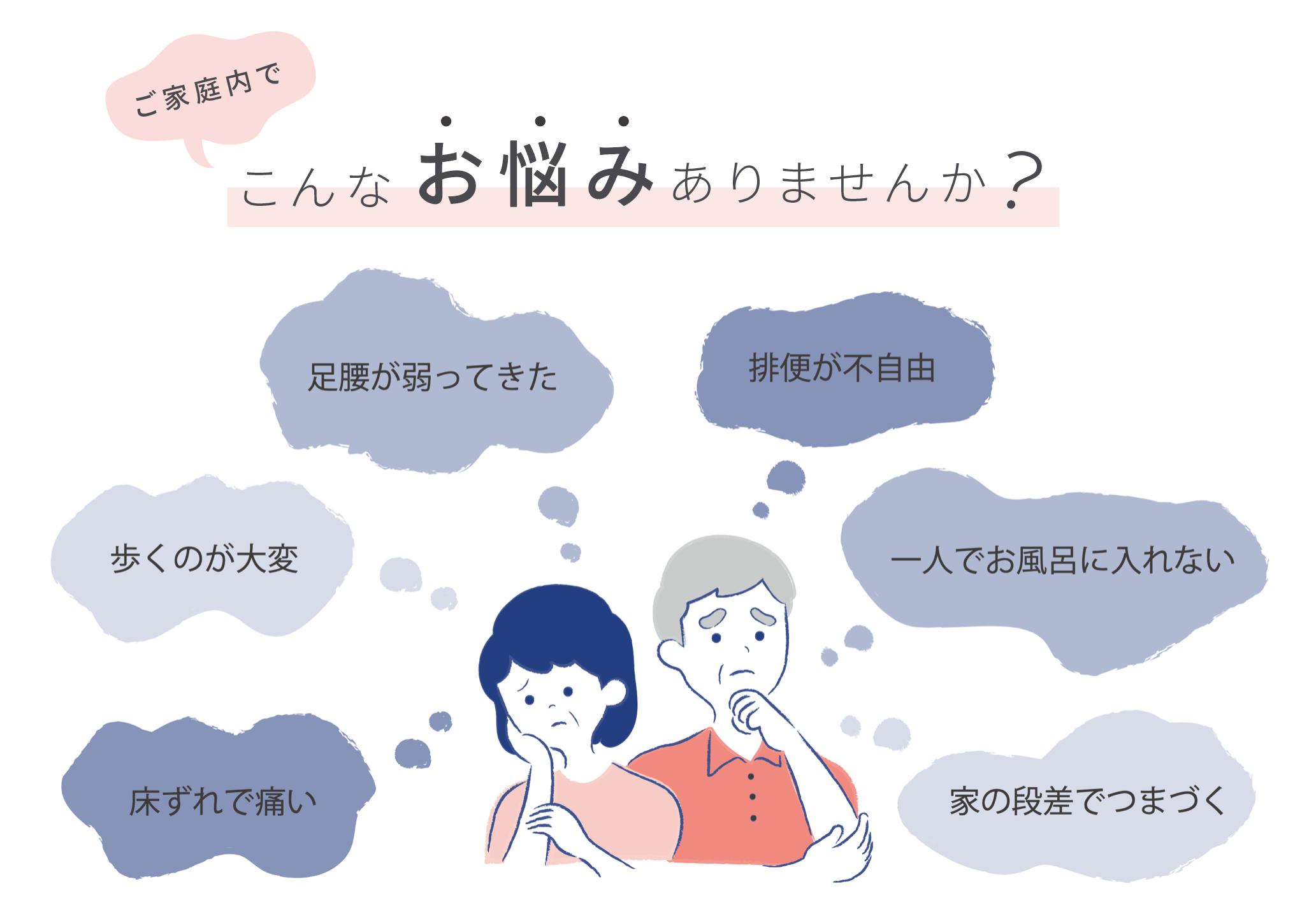 「介護疲れ」という言葉もあるように、介護のお悩みは尽きません。これからも笑顔で暮らしていくために、介護・福祉用具を検討される方も多くいらっしゃいます。『For You』では、こんなお悩みをお持ちのご利用者様が利用されています。 |